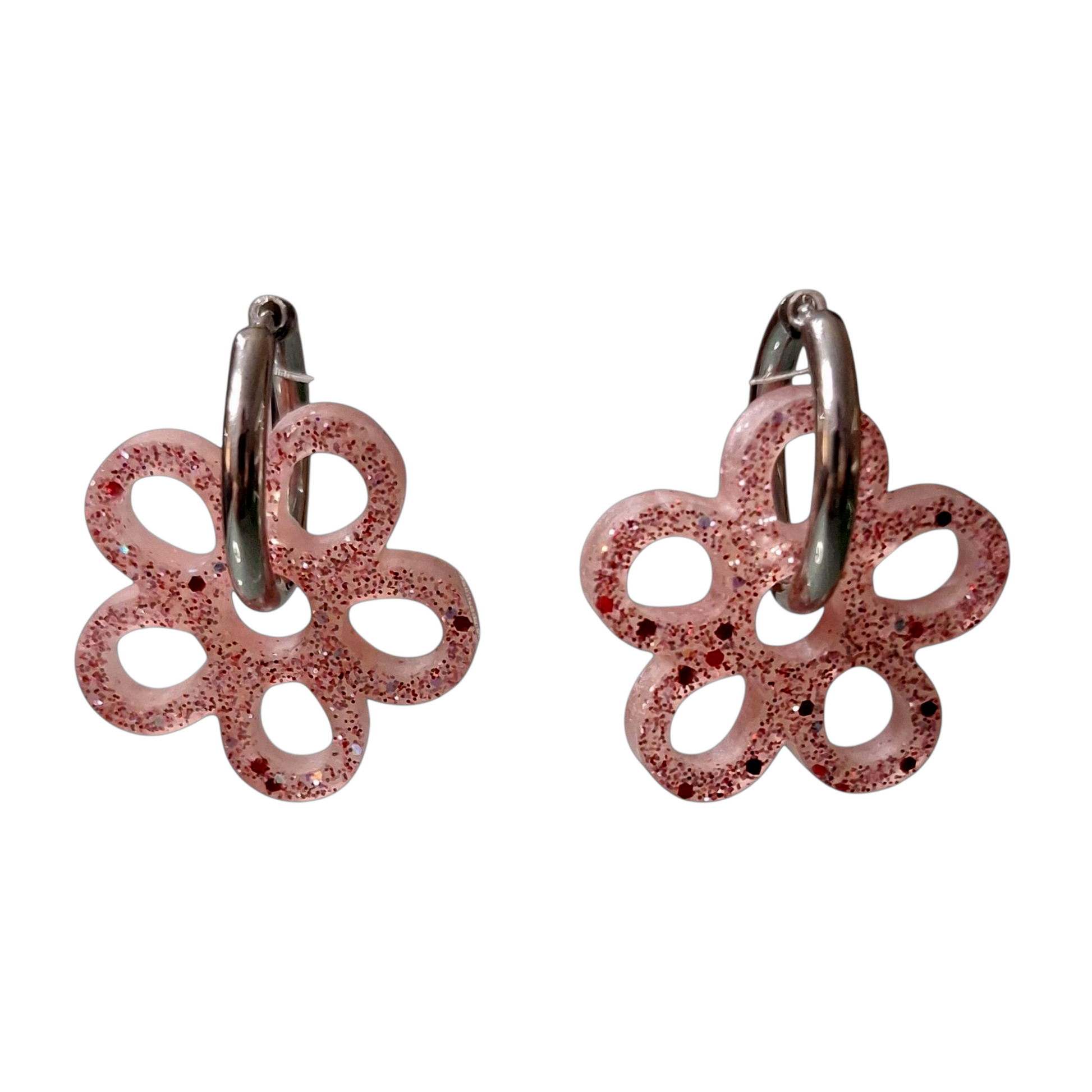 Boucles d’oreilles fleur rose ajourée pailletée en résine époxy – Création artisanale