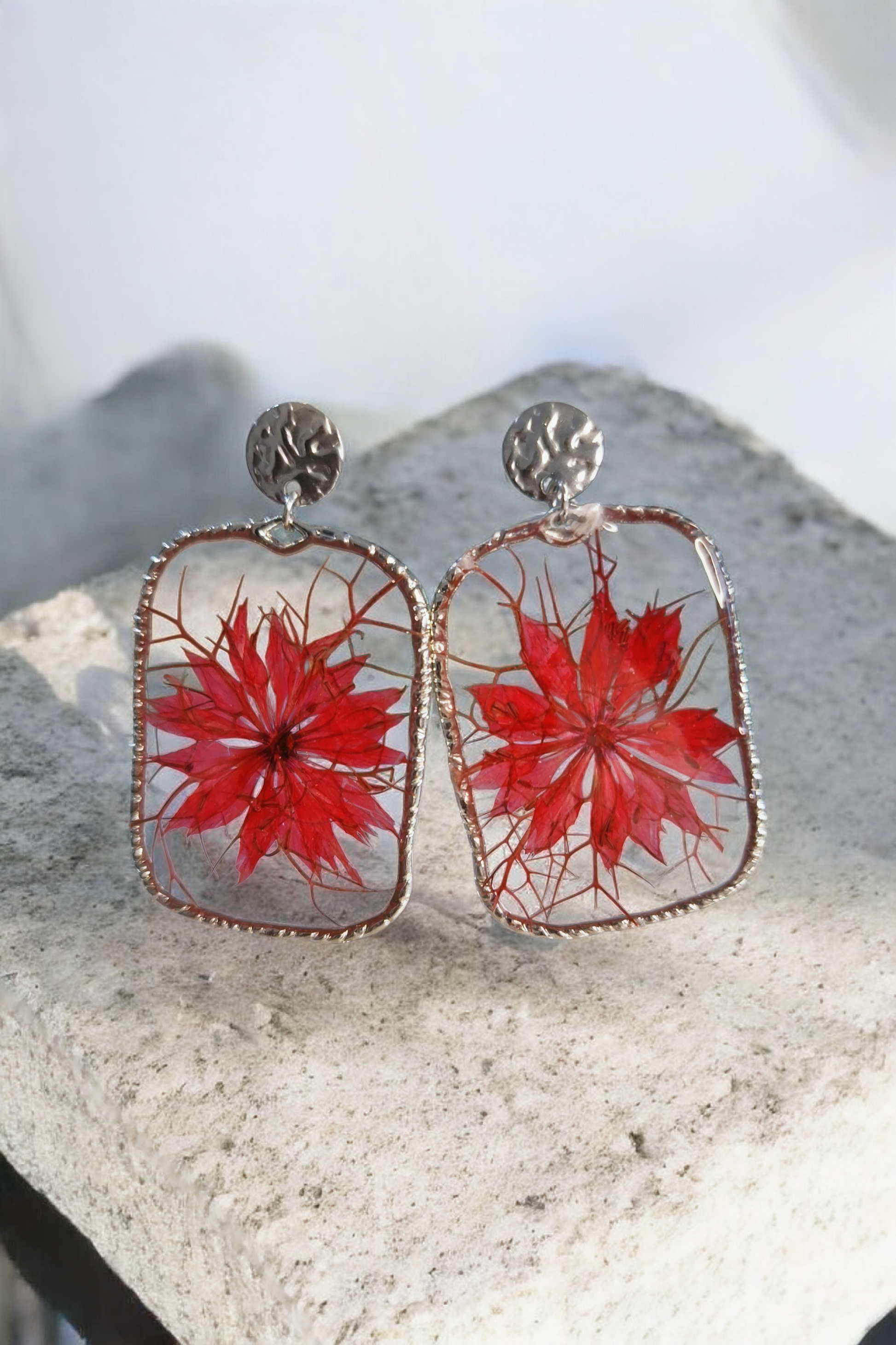 Portez un morceau de nature éternelle avec ces boucles d'oreilles uniques. Chaque paire renferme une véritable fleur séchée d'un rouge intense, figée dans une résine transparente comme du cristal pour un effet poétique et raffiné.