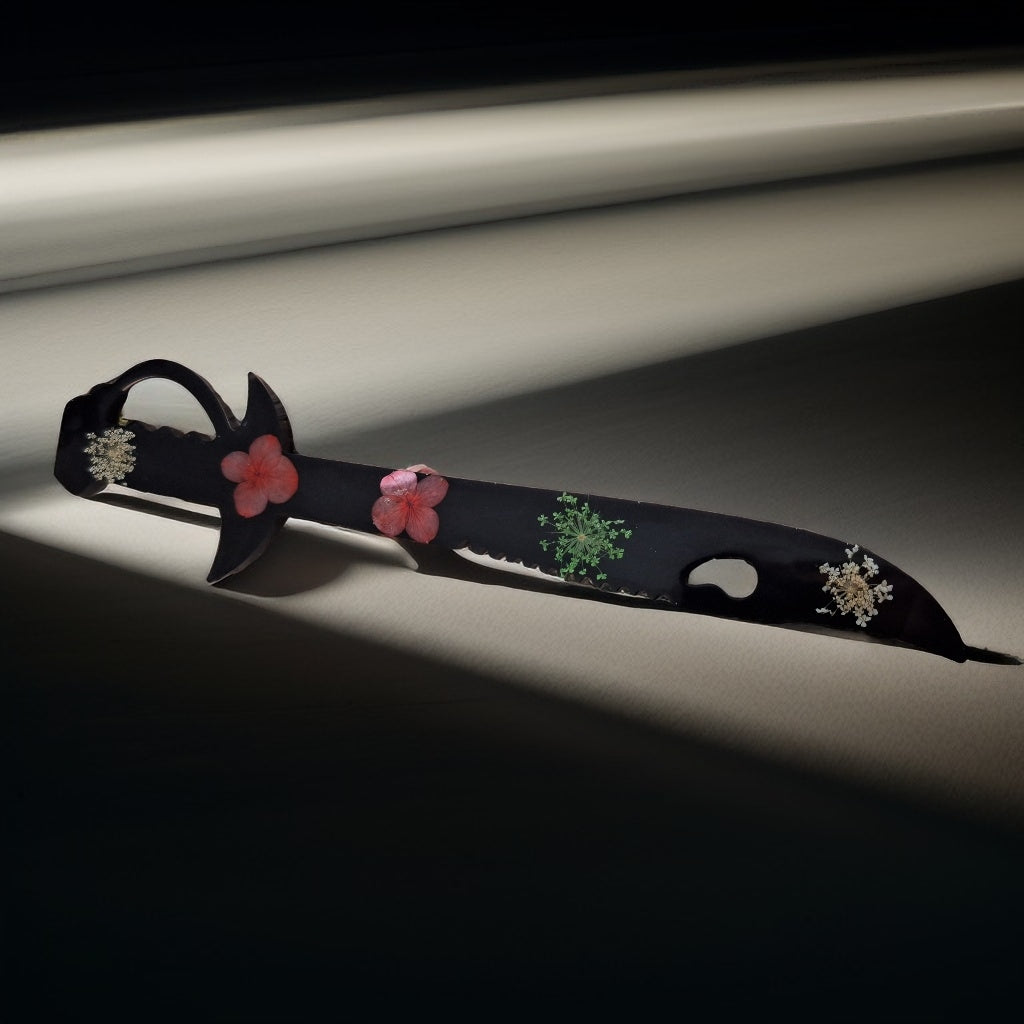 Sublimez votre collection avec ces magnifiques dagues et épées en résine époxy, alliant élégance et originalité. Chaque pièce est minutieusement fabriquée à la main et ornée de véritables fleurs séchées, offrant un contraste saisissant entre la résine noire et la délicatesse des fleurs colorées.