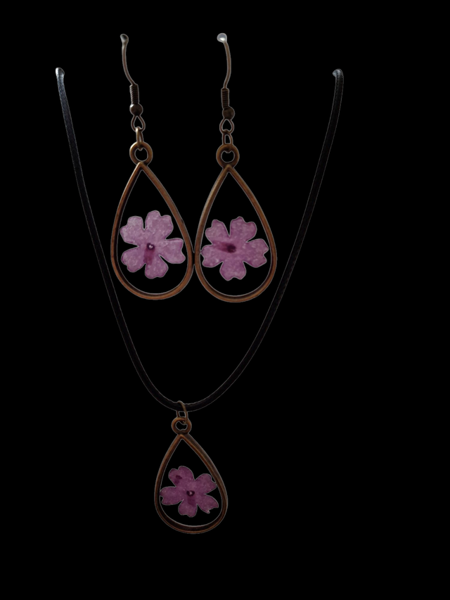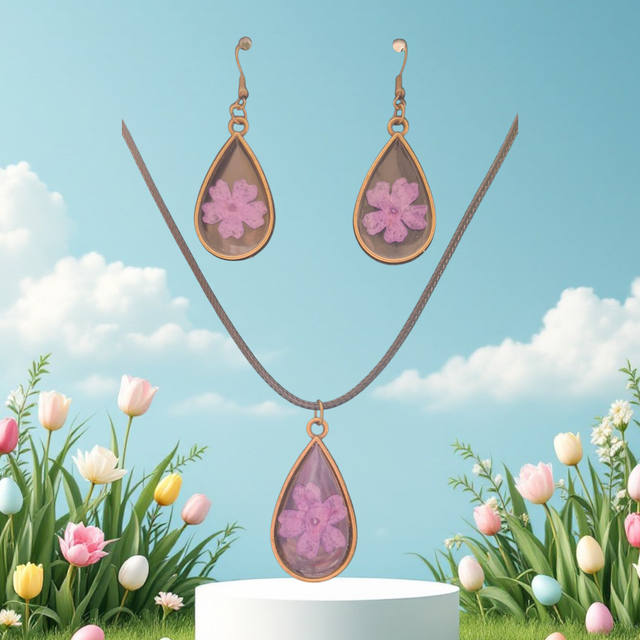Laissez-vous séduire par cette parure artisanale composée d’un pendentif et de boucles d’oreilles assorties, réalisée en métal et remplie de résine époxy transparente. Chaque pièce renferme une véritable fleur naturelle, minutieusement séchée et intégrée à la main, offrant un bijou délicat, poétique et unique.