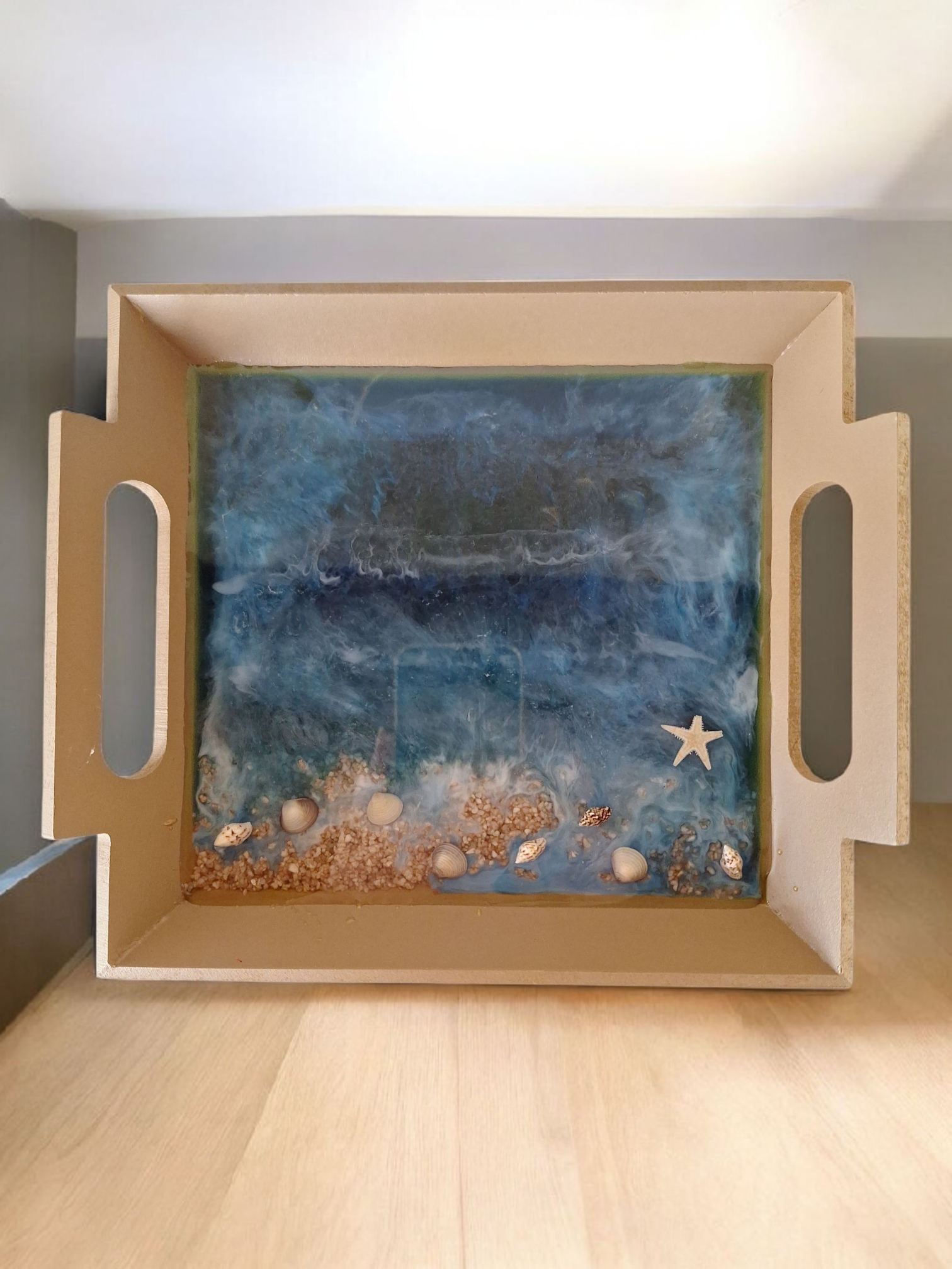 Plateau de Service Décor Marin en Résine Époxy et Bois | Scène de Plage