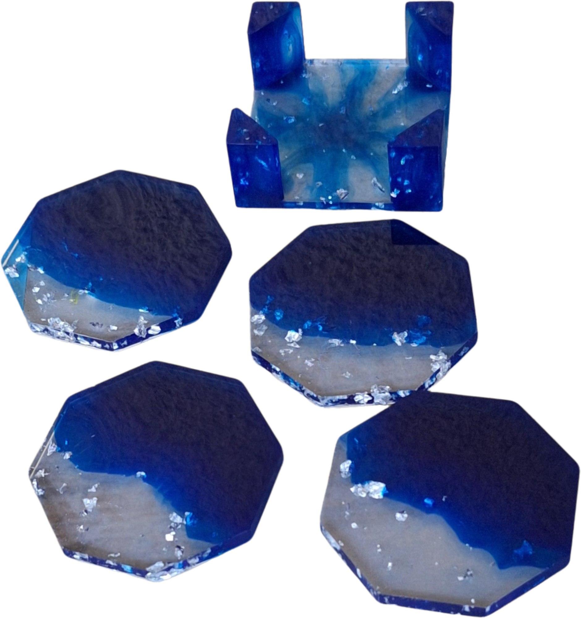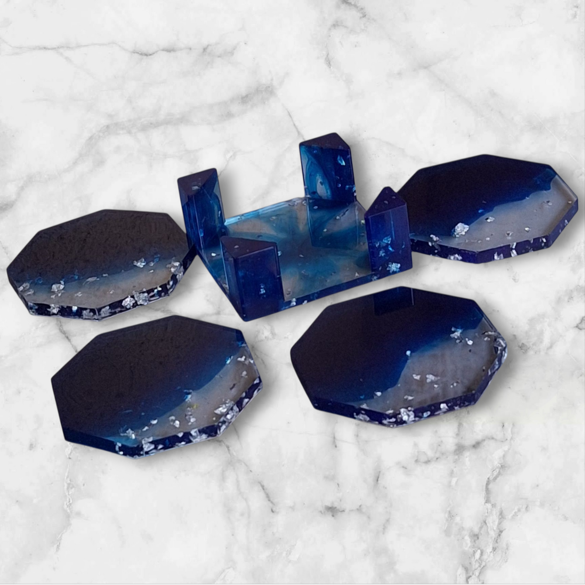 Set de 4 sous-verres octogonaux en résine époxy bleu océan avec éclats scintillants. Support assorti inclus. Pièce unique faite main